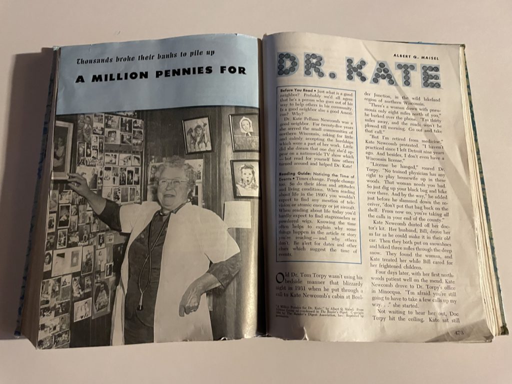 The lowly penny became a symbol of the project when local students sought to collect a million of them for Dr. Kate’s hospital. The absurdity of it all, a humble Northwoods doctor and school kids collecting a million pennies to build a hospital, captured the imagination of the American people and the world. Donations of pennies came in from every state along with many foreign nations.